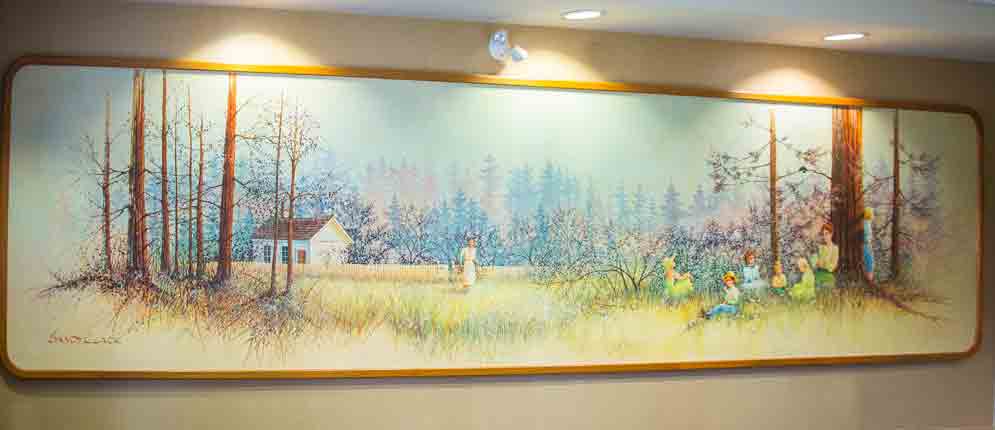 This mural evokes memories of a bygone time; the days of schoolhouses, where teachers taught children of all ages in one room. It portrays a lesson out in the meadow, under the trees. It was originally painted for Marg and Al Johnson, long time business owners and Chemainiacs, for one of their businesses, Small Tall Treats. Their daughters subsequently gave the painting to the Chemainus Festival of Murals Society. It is now permanently installed at the Best Western PLUS Chemainus Inn.
