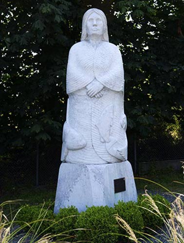 The marble sculpture represents a mystic Native princess, her robe adorned with the wildlife of Vancouver Island. An orca dives from her hair, an eagle soars interconnected with a salmon leaping upwards. The upper half of the sculpture depicts the quiet calm of the earth, while the lower portion depicts the world in action. The princess represents the Earth, the lifegiver, the source of our livelihood. She is stone – marble, transcending thousands of years of pressure and heat, to be transformed again.