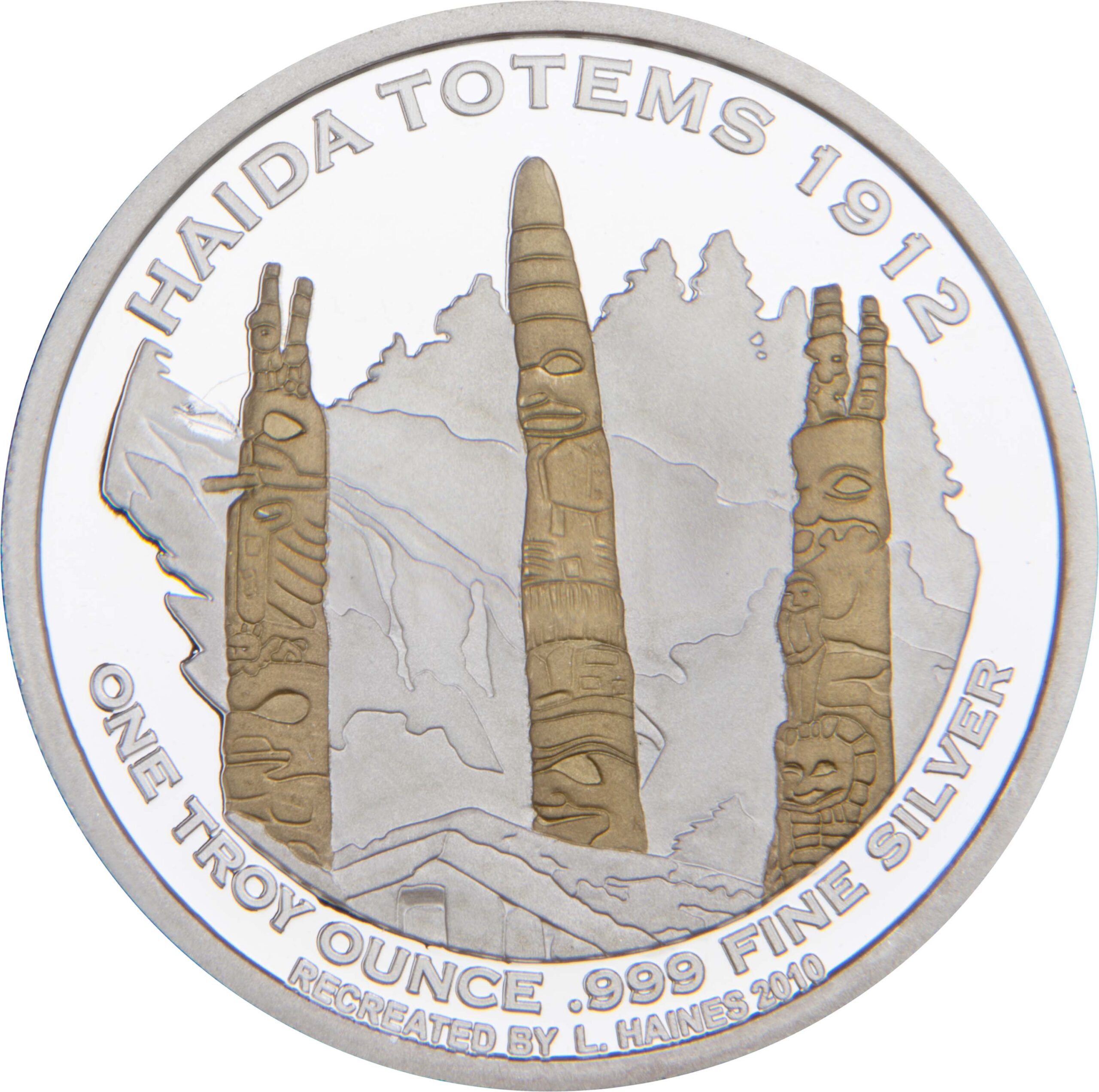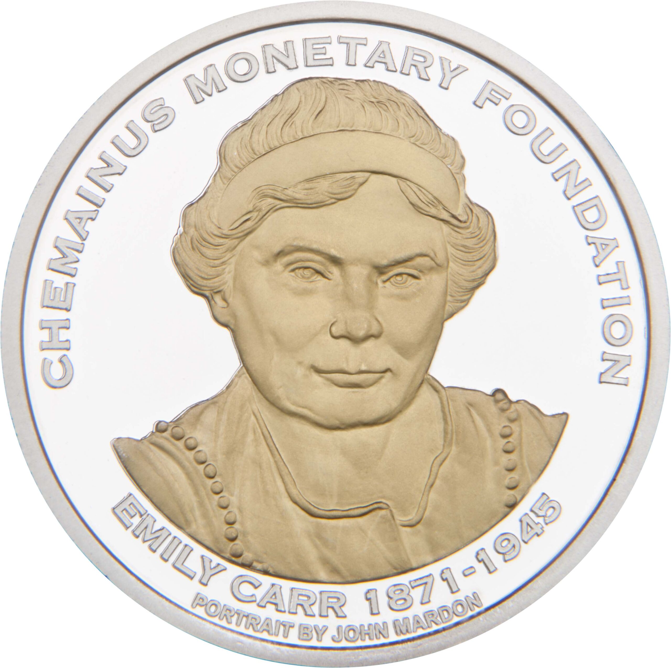 Emily Carr Gold Plated Medallion, One Troy ounce, .999 per oz. fine silver. 24K Gold enhancements. The reverse image is a finely engraved detail from Emily Carr’s oil painting titled “Totem Forest” from Haida Gwai.
