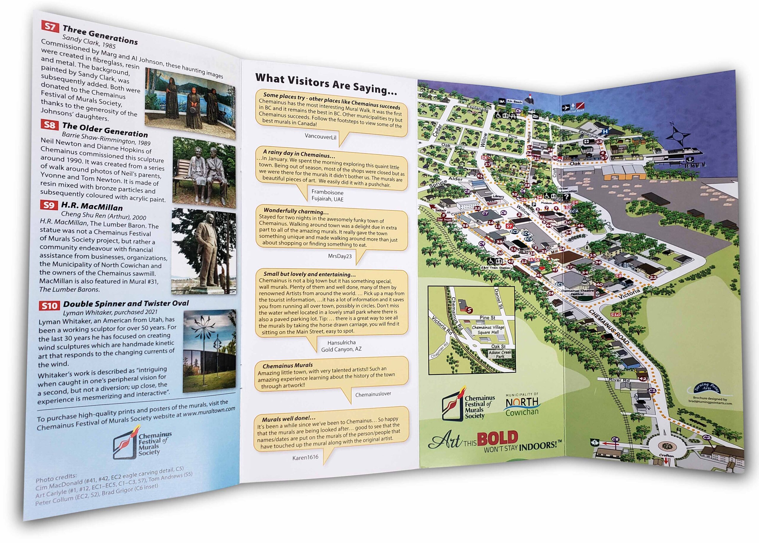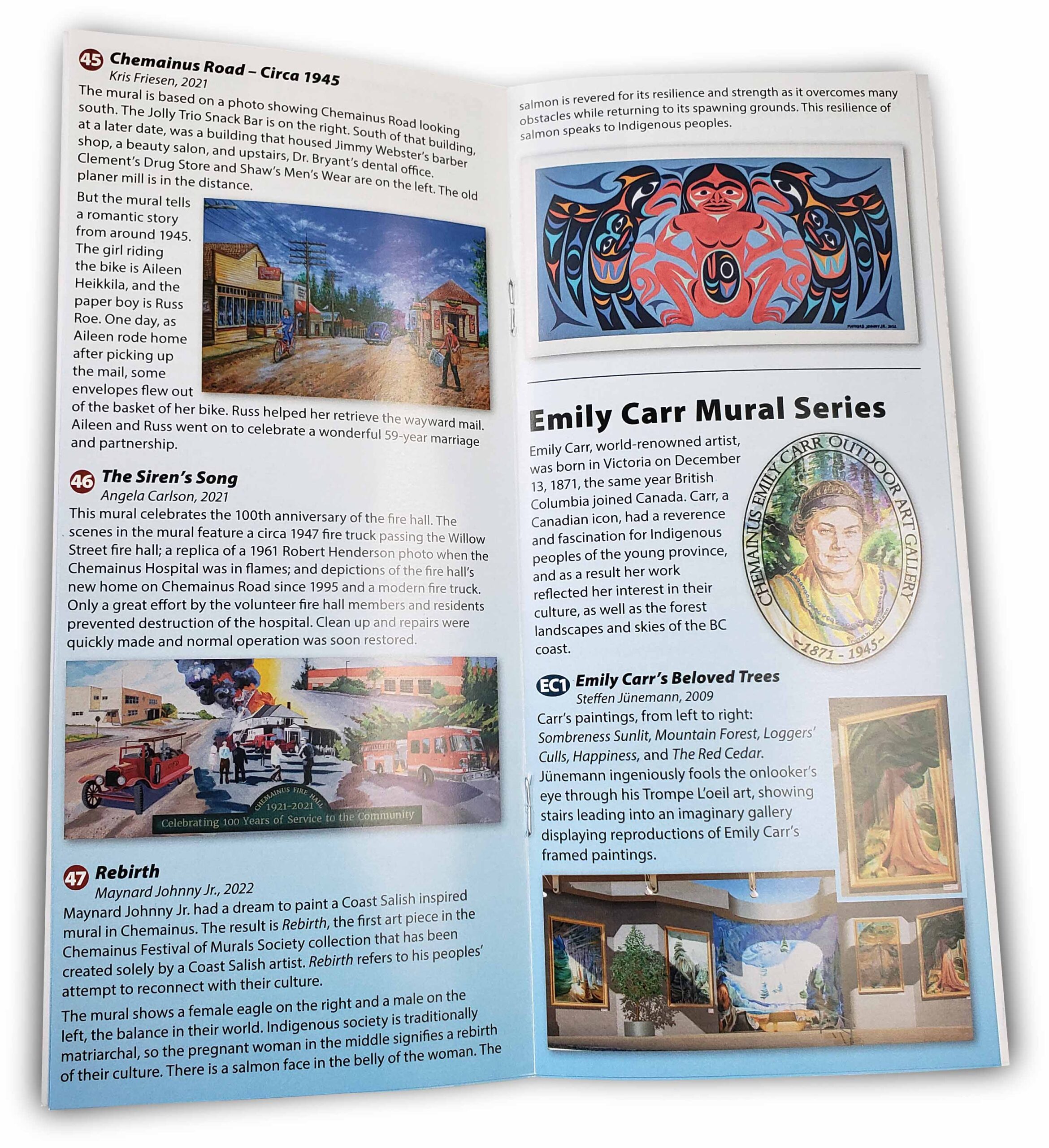 A new edition reproduced in October, 2022 now includes all attractions added to the Society collection of art since 2019. This full colour, user-friendly booklet includes a fold-out map showing the location of all murals and sculptures in Chemainus along with a description of each mural.