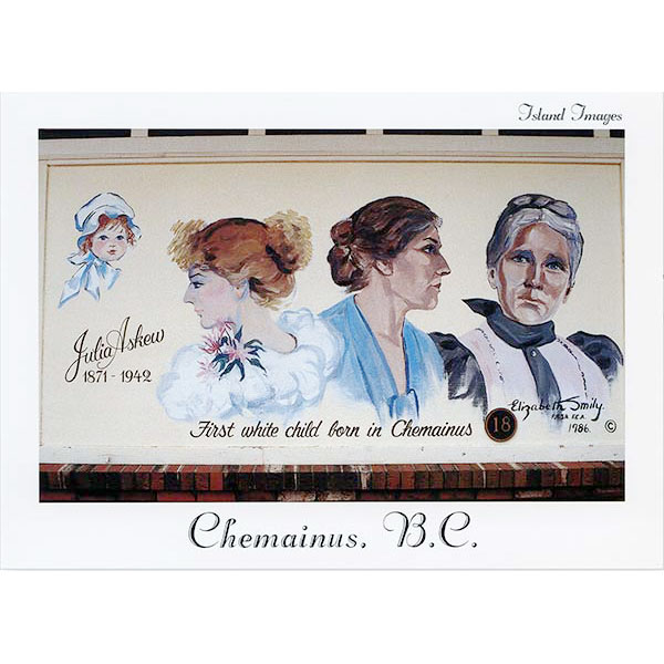 11 cm x 15 cm (4” x 6”) post card of mural 18 “Julia Askew – First Child Of European Ancestry Born In The Chemainus Valley”